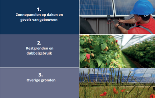 De afwegingprincipes van de NOVI leiden tot een voorkeur voor zonnepanelen op daken en gevels van gebouwen. Om aan de gestelde energiedoelen te voldoen, kan blijken dat ook locaties in het landelijk gebied nodig zijn. Ook in dat geval gaat de voorkeur uit naar het zoeken van slimme functiecombinaties. Hoewel natuur- en landbouwgebieden daarbij niet volledig worden uitgesloten, ligt de voorkeur bij gronden met een andere primaire functie dan landbouw of natuur, zoals waterzuiveringsinstallaties, vuilnisbelten, binnenwater en areaal in beheer van het Rijk (zoals Rijkswaterstaat, ProRail, Staatsbosbeheer), waaronder waar mogelijk bermen van spoor- en autowegen.