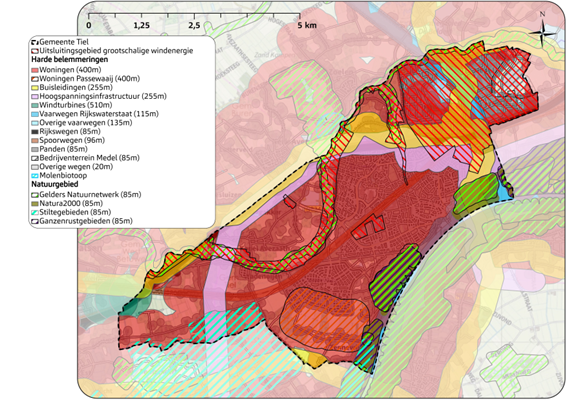 Het doel van de ruimtelijke analyse is om alle gebieden waar op basis van harde beperkingen geen windparken mogelijk zijn in kaart te brengen. Dit leidt dan omgekeerd tot de mogelijke gebieden binnen Tiel waar windparken eventueel gerealiseerd kunnen worden. Dit betreft dus een analyse waarbij uitgegaan is van technische en juridische belemmeringen en van beleidsbelemmeringen die leiden tot ruimtelijke beperkingen.