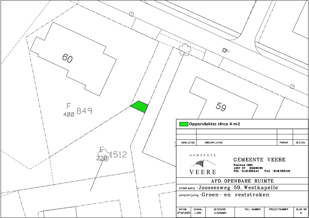 De gemeente Veere heeft het voornemen om een groenstrook, gelegen nabij de Joossesweg 59 te Westkapelle, ter grootte van ongeveer 4 m2, thans nog deel uitmakende van het perceel kadastraal bekend gemeente Westkapelle, sectie F nummer 3041, te verkopen en te leveren aan de aangrenzende perceelseigenaren. De te verkopen groenstrook is in het groen weergegeven op bijgaande verkooptekening.
