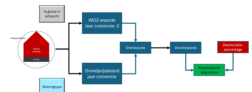 Van conversie is alleen sprake als de erfpachter vóór beëindiging van het lopende erfpachtrecht besluit zijn tijdelijk erfpachtrecht om te zetten naar een eeuwigdurend erfpachtrecht, al dan niet in combinatie met koop van het bloot eigendom. Bij deze conversie wordt de grondslag (de conversiewaarde) voor de nieuwe jaarlijkse canon voor het jaar van conversie bepaald op basis van de in hoofdstuk 2 (figuur 1 en 2) beschreven wijze voor het jaar van conversie.