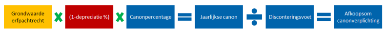 Na heruitgifte op basis van eeuwigdurende erfpacht of vroegtijdige conversie van het bestaande erfpachtrecht wordt de nieuwe canonverplichting bepaald met behulp van het canonpercentage. Bij afkoop van de canonverplichting wordt de afkoopwaarde bepaald met behulp van de disconteringsvoet.