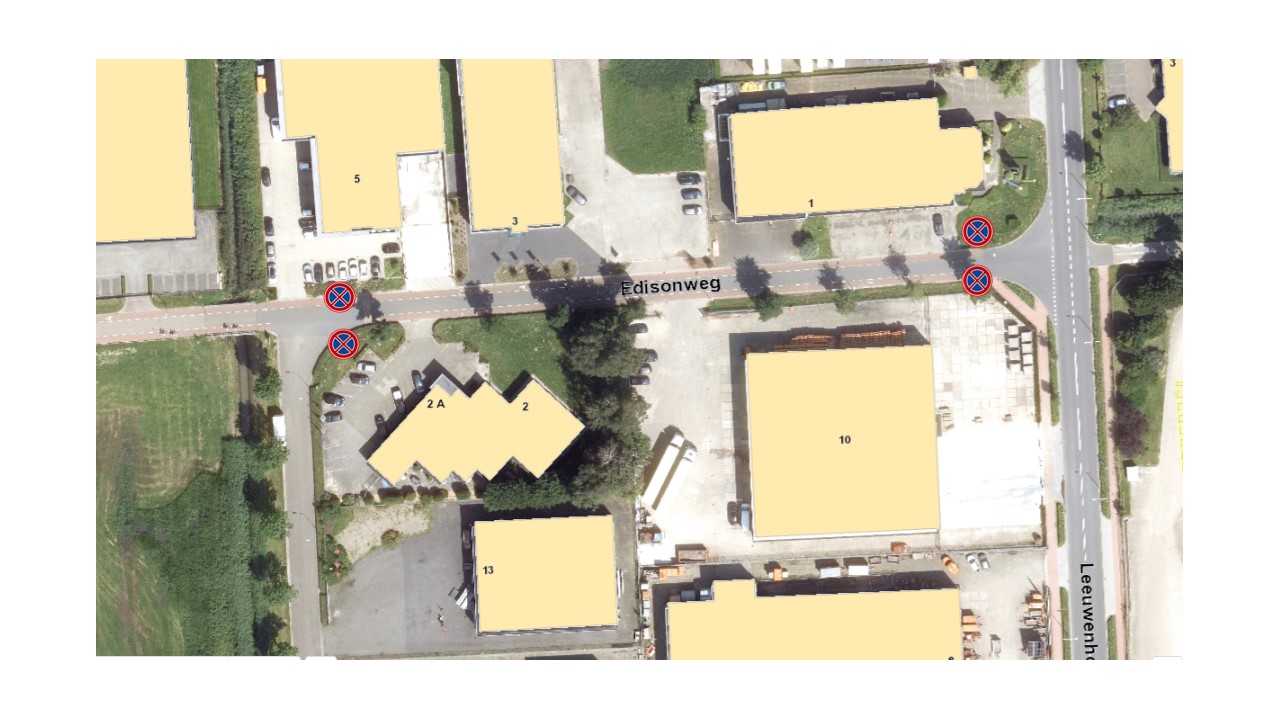 • een stopverbod op de Edisonweg vanaf het kruispunt met de Leeuwenhoeckweg tot aan het kruispunt met de Costerweg zorgt ervoor dat de inritten van de bedrijven aan de Edisonweg niet geblokkeerd worden;