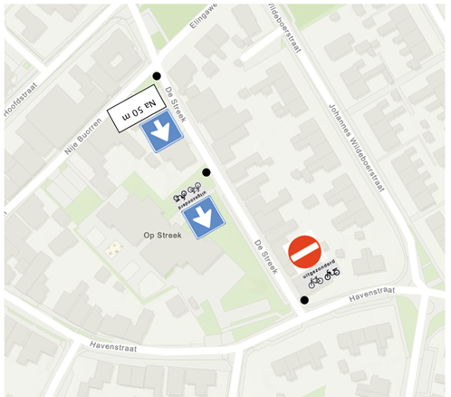 Van de bewoners van De Streek is een verzoek ontvangen voor het instellen van éénrichting vanaf huisnummer 2. De weg is te smal voor het passeren van 2 auto’s. En aan de kant van de woningen is geen trottoir waardoor bewoners direct op de weg staan bij het verlaten van het perceel. Men ervaart de huidige situatie als onveilig.