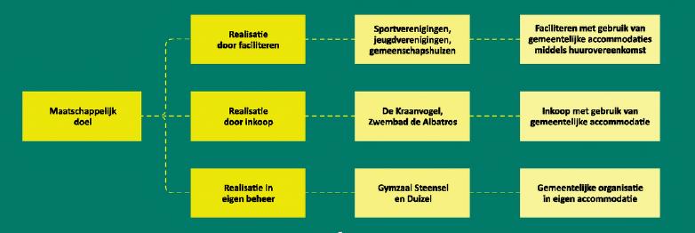 Vanuit het perspectief van sporten, sociale activering, ontmoeting en cohesie kan dit ruime aanbod beschouwd worden als een ‘groot goed’, er is immers voor iedereen in ieder dorp een (gemeentelijke en/of private) accommodatie beschikbaar. Het maatschappelijke doel met de bijbehorende activiteit is leidend en de accommodatie wordt daarbij gezien als een middel. In de dorpen wil men graag dat de activiteiten in de eigen kern blijven bestaan ten behoeve van de leefbaarheid. Ieder dorp beschikt over basisvoorzieningen teneinde bepaalde activiteiten te kunnen invullen. Op het gebied van sport zijn van oudsher een aantal basissporten benoemd (voetbal, korfbal, tennis, hockey, atletiek, honkbal, zwemmen, en gymonderwijs), met daaraan gekoppeld een groot aantal basisvoorzieningen zoals de beschikking over sportvelden, verlichting, kleedlokalen, inrichting van de buitenruimte etc. Deze basisvoorzieningen werden in verleden ook wel beschouwd als een recht op. De afgelopen periode is meer de nadruk gelegd op van ‘recht hebben op’ naar ‘zorgen dat’ en op deze manier komen tot de doelstellingen op het gebeid van sporten bewegen en ontmoeten. Van basisvoorziening naar maatwerk. Het betreft noodzakelijke voorzieningen die niet rendabel zijn vanuit een puur financieel perspectief voor een betaalbaar verenigingsleven, maar waar toch behoefte aan is binnen de gemeenschap. Voorbeelden hiervan zijn sportvelden, kleedlokalen, sporthallen, gemeenschapshuizen en jeugdhuizen. Voorbeelden van niet-basisvoorzieningen zijn voorzieningen die ‘rendabel’ zijn vanuit een puur financieel perspectief voor een betaalbaar verenigingsleven, zoals kantines, padelbanen. Aan de hand van het afwegingskader in bijlage 1 wordt inzichtelijk gemaakt wat de rol van de gemeente is bij nieuwe initiatieven.