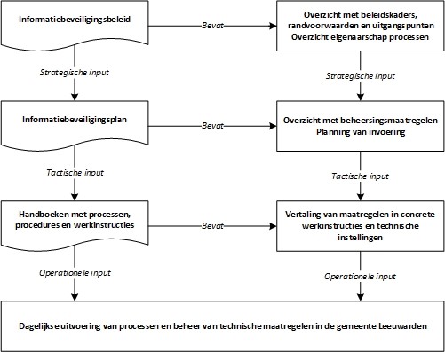 Het doel van het beleid is het beheersen van risico’s rond de ontwikkeling, het beheer en de het gebruik van de ICT-infrastructuur, de informatiesystemen en ICT-bedrijfsmiddelen, de informatie-uitwisseling, de informatie zelf, en de gebruikers van die informatie. In het informatiebeveiligingsplan worden de beleidsuitgangspunten nader uitgewerkt. Op basis van risicoanalyses wordt gekozen welke concrete technische en organisatorische maatregelen noodzakelijk zijn om de informatiebeveiligingsdoelstellingen uit dit beleid te bereiken. Deze vertaling is weergegeven in onderstaand figuur 1.