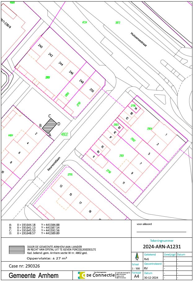 Liander N.V. is voornemens om nabij de Keurvorstlaan 2, kadastraal bekend gemeente Arnhem, sectie W nummer 4802 gedeeltelijk, een middenspanningsruimte (hierna: MSR) te realiseren ten behoeve van de stroomvoorziening van het omliggende gebied. De MSR dient te worden gerealiseerd op de locatie zoals aangegeven op bijgaande tekening met nummer 2024-ARN-A1231. Liander heeft om deze reden verzocht tot vestiging van een opstalrecht op deze locatie (circa 27m2) ten behoeve van Liander.