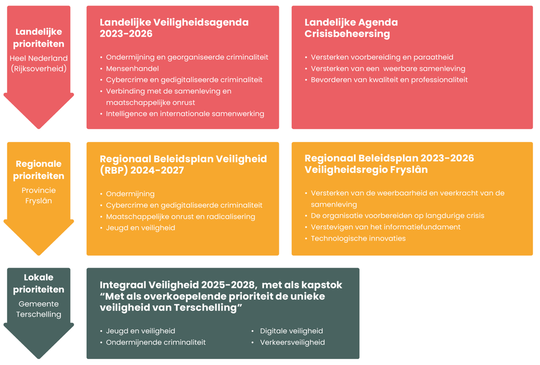 Als overkoepelende prioriteit stellen we in dit IVP de focus op de ‘Unieke veiligheid van Terschelling’ vast. Met deze centrale insteek verbinden we alle uitdagingen van het eiland en benadrukken we de specifieke aanpak die hiervoor nodig is. Deze prioriteit fungeert als verbindend thema binnen het veiligheidsbeleid en loopt als rode draad door alle andere onderwerpen heen. De ‘Unieke veiligheid van Terschelling’ wordt meerdere keren in dit plan aangestipt, hoewel deze niet apart als prioriteit wordt uitgewerkt.