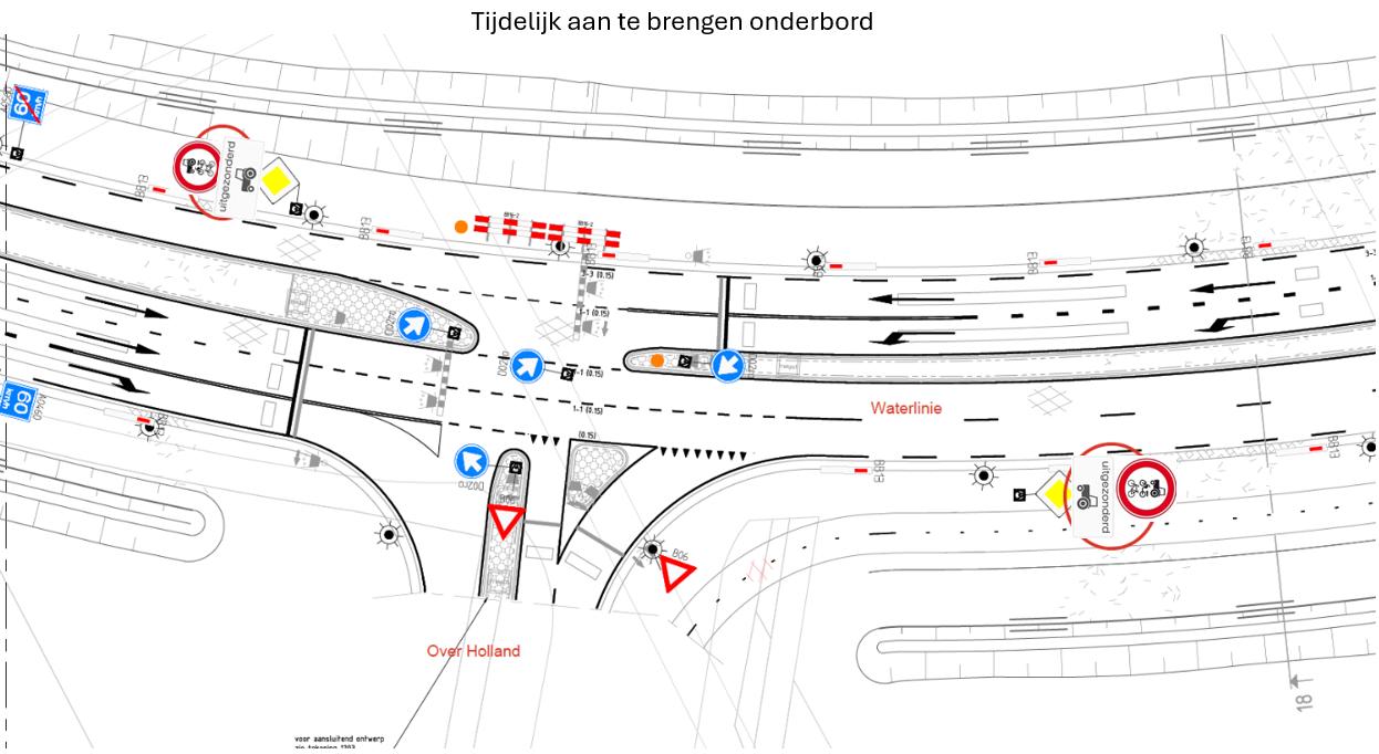 Gedurende de periode tot november 2026 of zoveel langer of korter als nodig is voor de werkzaamheden van de Korte Muiderweg die de aanleiding zijn van dit besluit de volgende verkeersmaatregel in te stellen op de Waterlinie direct ten noorden van Over Holland op de locaties zoals afgebeeld op de bijgevoegde situatietekening: