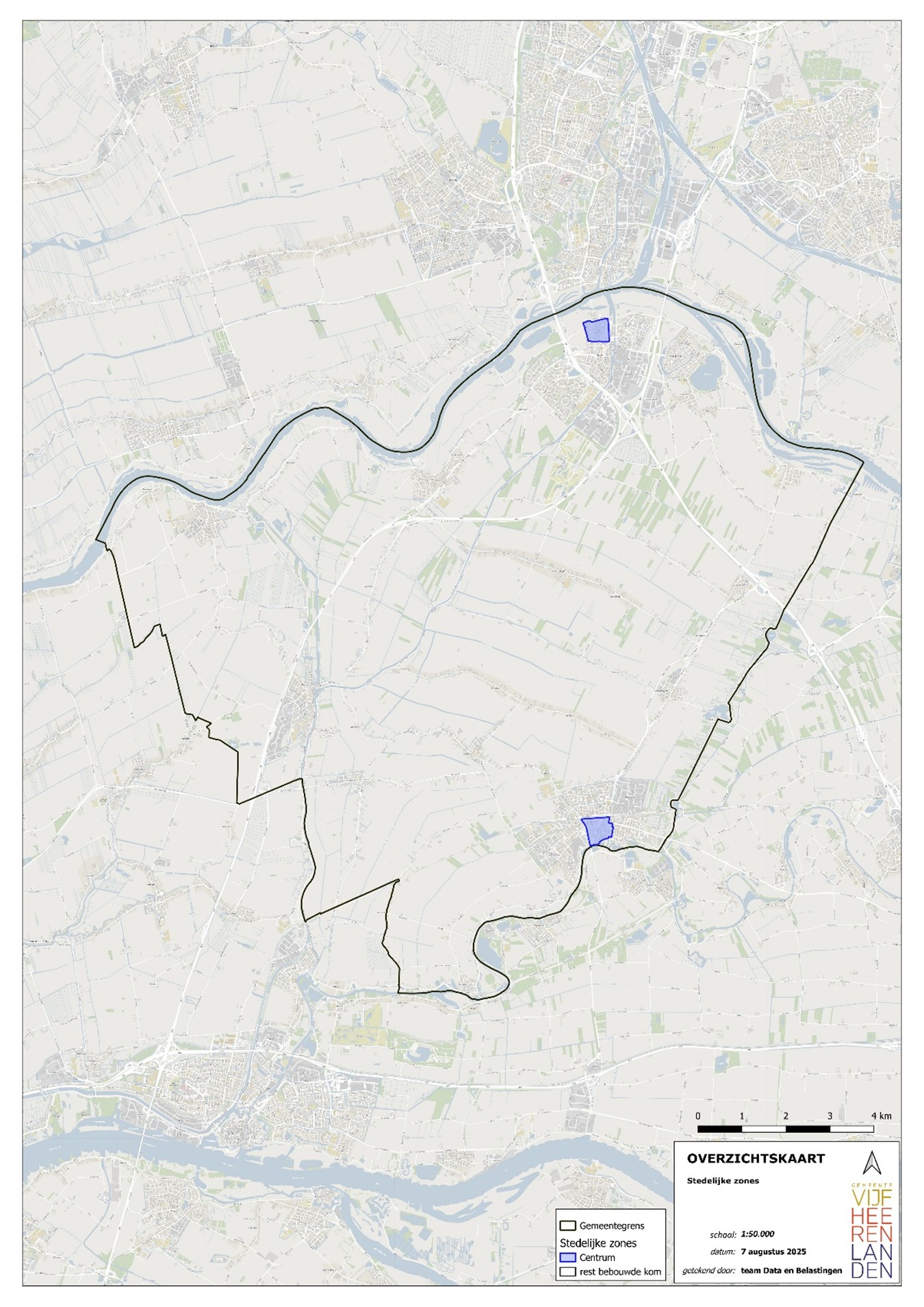 Voor de gemeente Vijfheerenlanden kiezen we voor een indeling in twee zones. Dit doen we omdat de kernen van Vijfheerenlanden relatief klein zijn. De indeling voor Vijfheerenlanden is als volgt: