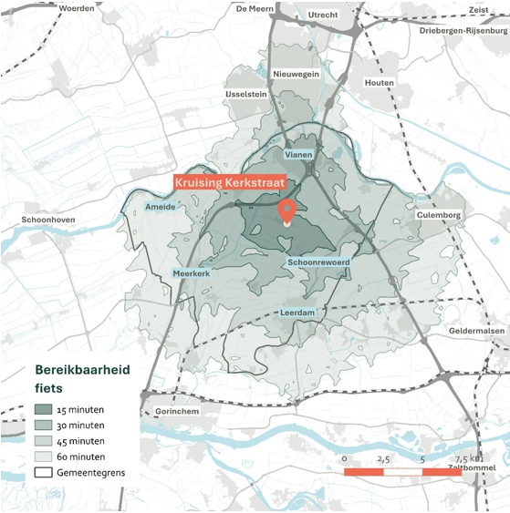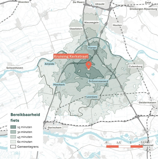 Een mogelijke doorfietsroute tussen Leerdam en Vianen lijkt op dit moment minder kansrijk. De oriëntatie van beide steden ligt vooral in andere richtingen: Leerdam richt zich meer op Gorinchem, terwijl Vianen sterk verbonden is met Nieuwegein en Utrecht. Daarnaast is de afstand tussen Leerdam en Vianen voor veel fietsers relatief groot. Dit is terug te zien in de bereikbaarheidsanalyses (Bijlage D). De fietsafstand beperkt de kansrijkheid van een doorfietsroute tussen beide steden. Waar kansen zich voordoen onderdelen te verbeteren, zoals de verbinding door Gaasperwaard III, grijpen we die wel aan.