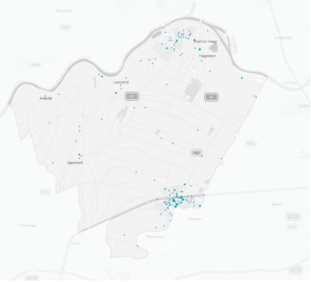 Vanaf 2026 start een provinciebreed systeem voor elektrische deelfietsen. In onze gemeente zullen in Vianen, Hoef en Haag en Hagestein op minimaal 18 locaties deelfietshubs komen.26 Hier kunnen gebruikers eenvoudig een elektrische fiets huren of weer inleveren. Deze locaties liggen voornamelijk bij ov-knooppunten en op bedrijventerreinen en zijn indicatief weergegeven in Figuur 26. Gemeente Vijfheerenlanden draagt financieel bij aan de opzet van dit systeem. De Provincie Utrecht stimuleert het gebruik van de deelfiets en neemt het grootste deel van de kosten op zich. De looptijd is van 2026 tot 2029 met mogelijkheid tot verlenging. Na evaluatie van dit systeem volgen mogelijk aanvullende maatregelen om het gebruik van deelfietsen verder te stimuleren.