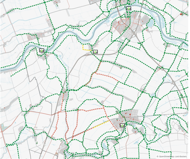 Het recreatief fietsknooppuntennetwerk is recent door de Provincie Utrecht aangepast. Recreatieve fietsers geven de voorkeur aan aantrekkelijke routes, zoals over de dijken. Deze dijktrajecten zijn vaak minder veilig, omdat ze – vooral bij mooi weer – intensief worden gebruikt door zowel auto’s als motoren. Dit gedeeld gebruik leidt tot spanningen en verhoogt het risico op onveilige situaties. Uit fietsdata, bijvoorbeeld van Strava, blijkt dat de dijken desondanks veel worden gebruikt door recreatieve fietsers. De gemeente Vijfheerenlanden beschikt over een relatief fijnmazig recreatief fietsroutenetwerk, waarbij veel wegen en fietspaden onderdeel uitmaken van dit netwerk.