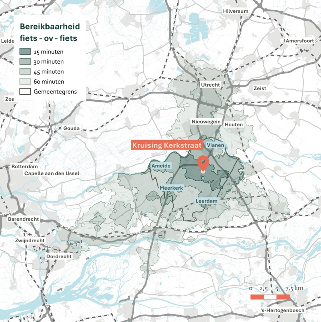 De combinatie van fiets met openbaar vervoer en lopen maakt het mogelijk om grotere afstanden binnen redelijke reistijd te overbruggen. Figuur 12 laat zien dat vanaf Hoef en Haag met deze vervoerscombinatie een aanzienlijk gebied binnen één uur bereikbaar is. Zowel Gorinchem als Utrecht valt binnen dit bereik. Dit illustreert het belang van multimodaal reizen voor het verbeteren van de bereikbaarheid van voorzieningen en werklocaties buiten de directe woonomgeving. Hierbij is de fiets het belangrijke eerste onderdeel van de reis.
