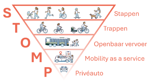 Figuur 8: Het STOMP-principe: stappen, trappen, ov, mobility as a service, privéauto
