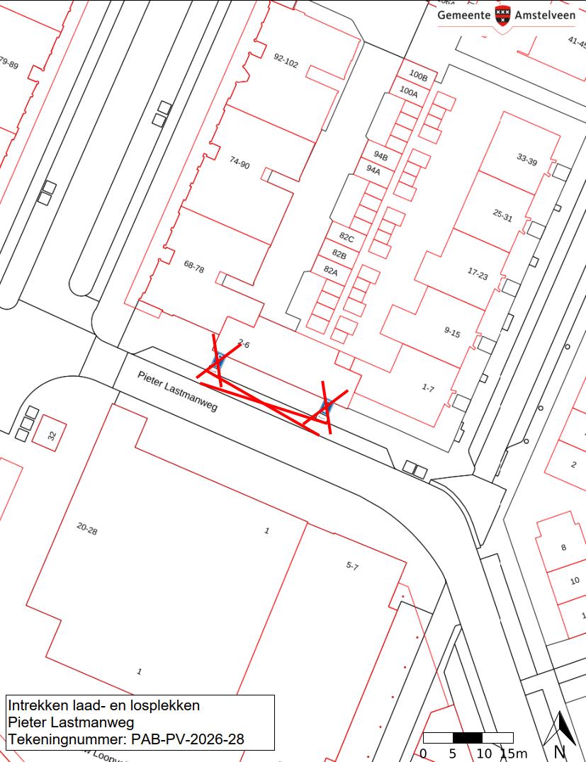 Burgemeester en wethouders van Amstelveen besluiten om de laad- en losplekken op de Pieterlastmanweg ter hoogte van huisnummers 2-6 op te heffen. Zoals te zien is in tekening: PAB-PV-2026-28. Binnen de parkeerverordening worden deze aangewezen als betaald parkeren zoals dit nu in de rest van de wijk ook gebeurd.