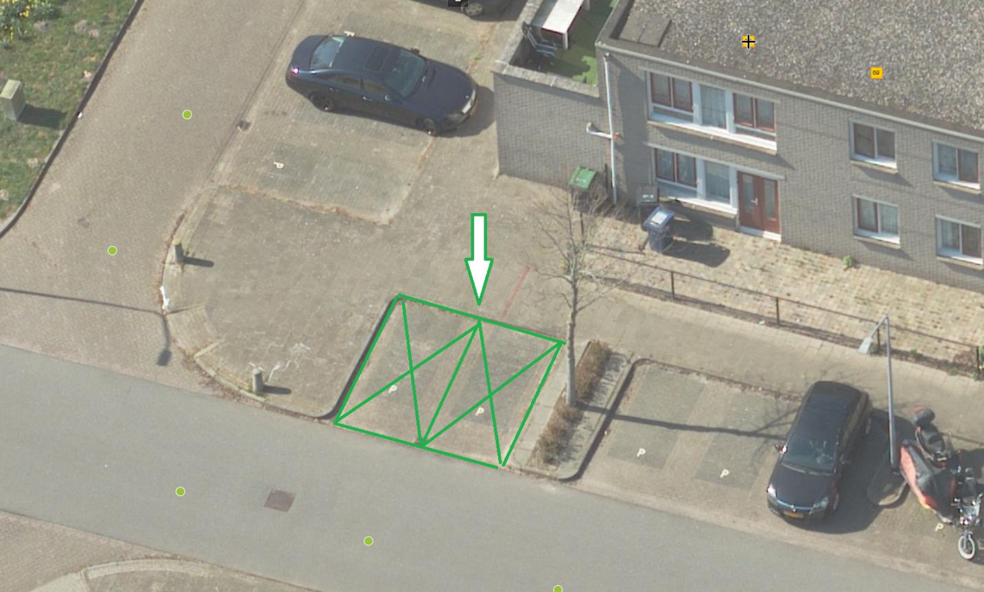 De parkeerplaatsen zijn alleen bedoeld voor het opladen van elektrische auto’s. Daarom plaatsen we het verkeersbord E08c (dit staat in bijlage I van het RVV 1990). We plaatsen ook het verkeersbord OB504 daaronder. Dit is een bord met twee pijlen die wijzen naar de parkeerplaatsen.