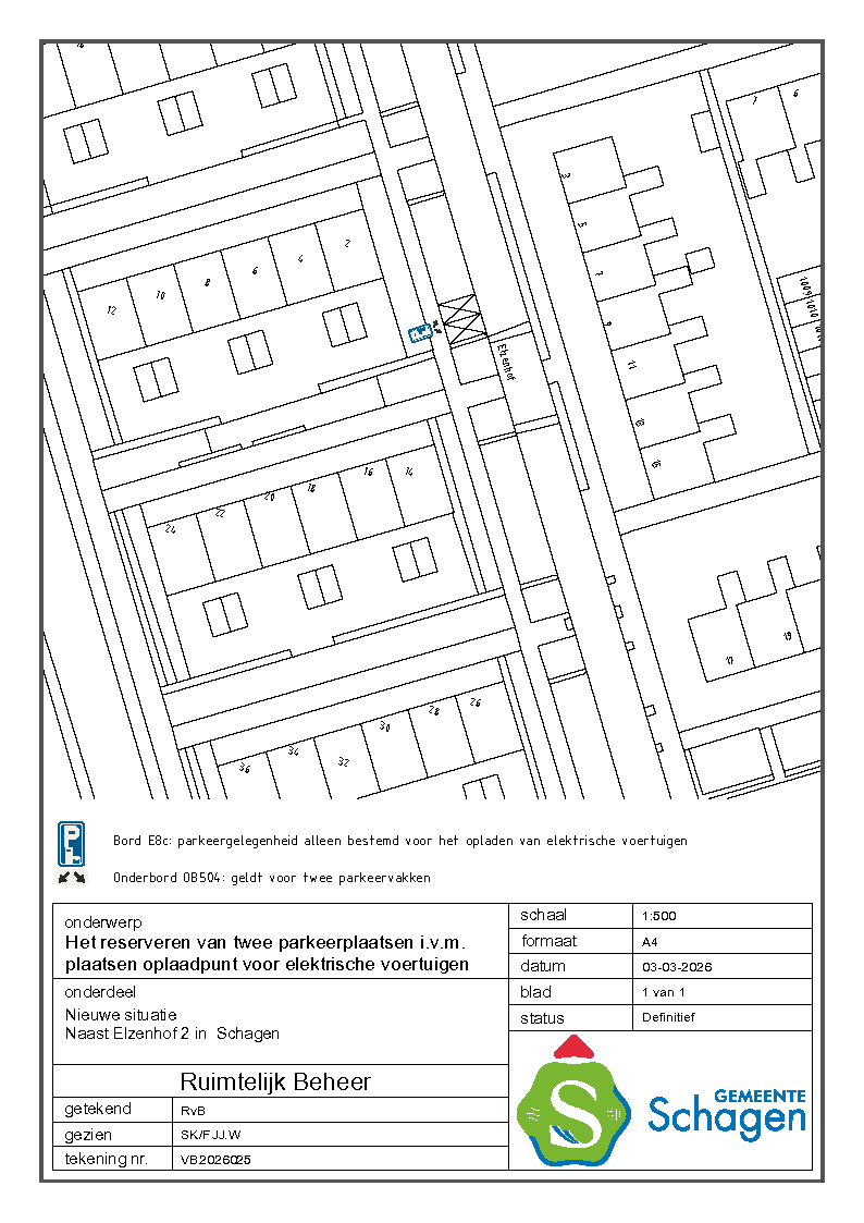 Gemeente Schagen- Verkeersbesluit reserveren van 2 parkeerplaatsen voor het opladen van elektrische voertuigen nabij Elzenhof 2, Schagen.