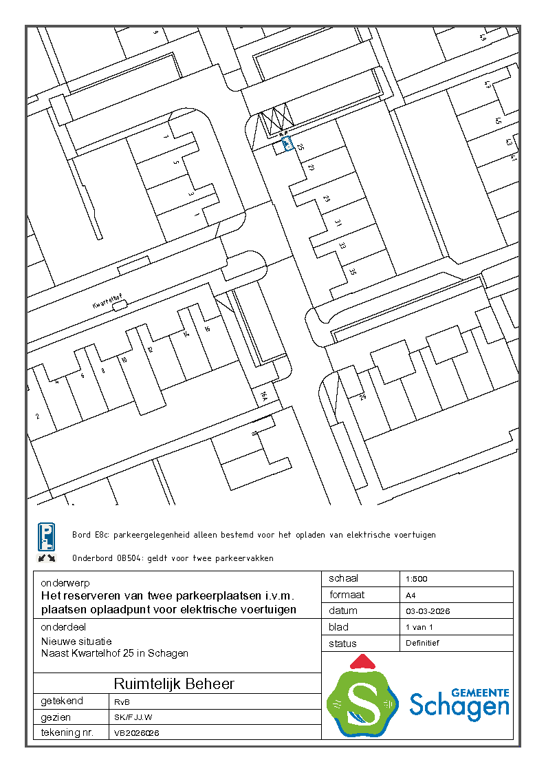 Gemeente Schagen- Verkeersbesluit reserveren van 2 parkeerplaatsen voor het opladen van elektrische voertuigen nabij Kwartelhof 25, Schagen.