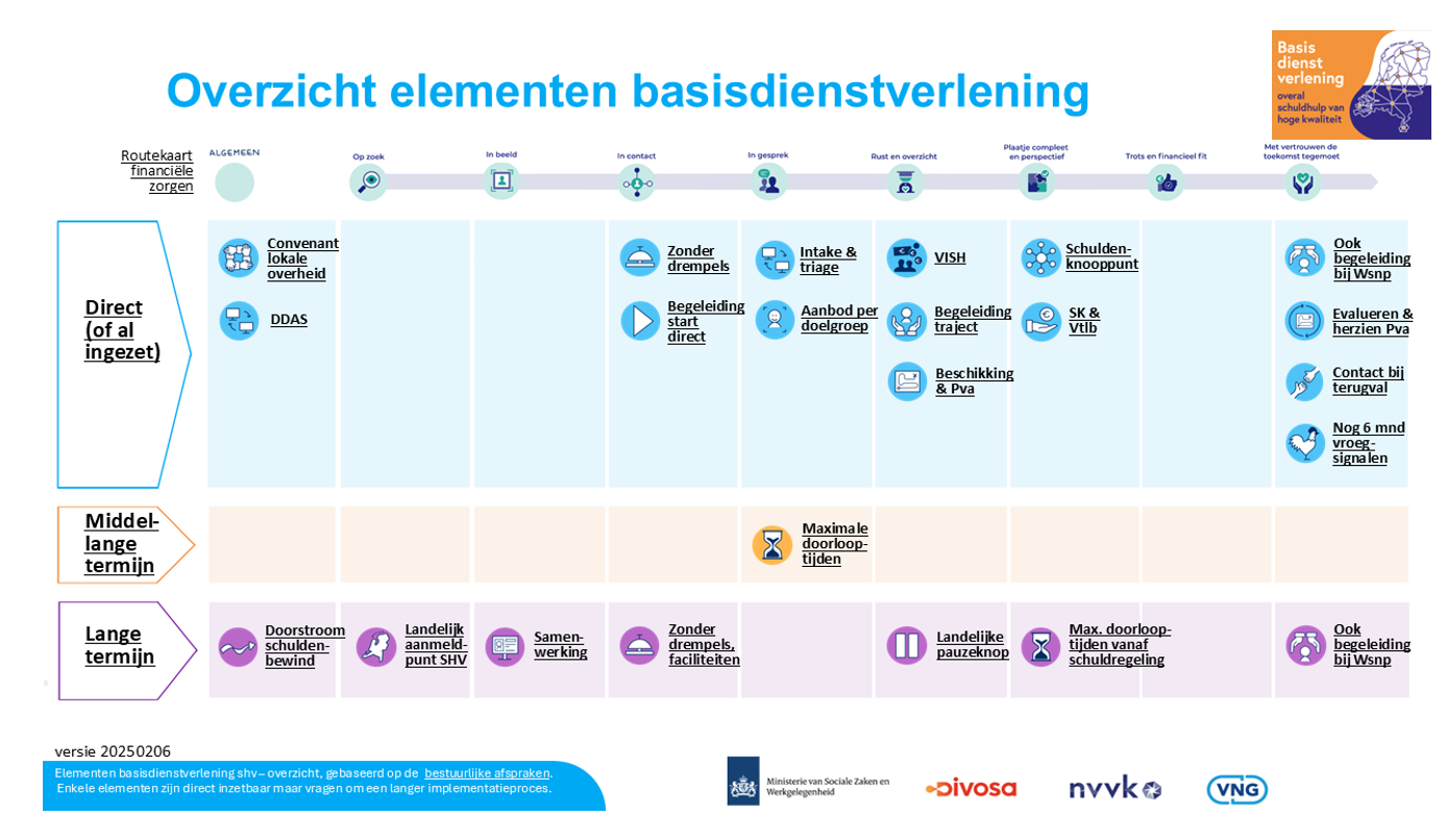 Op 21 maart 2024 hebben het kabinet, de VNG, de NVVK en Divosa bestuurlijke afspraken gemaakt en een gezamenlijk plan ondertekend dat ertoe moet leiden dat de schuldhulpverleningsafdelingen van alle gemeenten in Nederland aan een minimale kwaliteitsnorm voldoen. Dit plan, de ‘basisdienstverlening schuldhulpverlening’, moet zorgen voor snelle en kwalitatief goede hulp voor alle inwoners van Nederland met schulden. Om aan die kwaliteitsnorm te voldoen zijn er verschillende elementen opgesteld. De elementen zijn onderverdeeld in de verschillende fasen van een schuldhulpverleningstraject: in beeld, in contact, in gesprek, rust en overzicht, plaatje compleet & perspectief, met vertrouwen de toekomst tegemoet en algemeen.