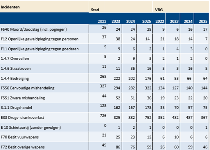 In de tabel hieronder worden de geweldsincidenten weergegeven binnen het VRG , al dan niet gepleegd met wapens, om een beeld te geven van de incidenten die hier plaats vinden. Naast de incidenten binnen het VRG worden de geweldsincidenten binnen de stad Leeuwarden weergegeven om zo meer duiding te geven hoe zich deze tot elkaar verhouden. Onder de tabel wordt met tekst uitleg gegeven over datgene wat staat afgebeeld.
