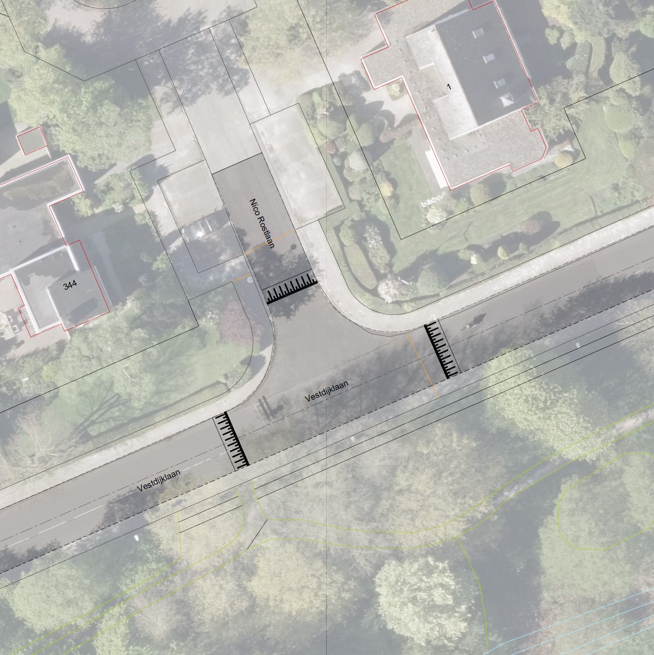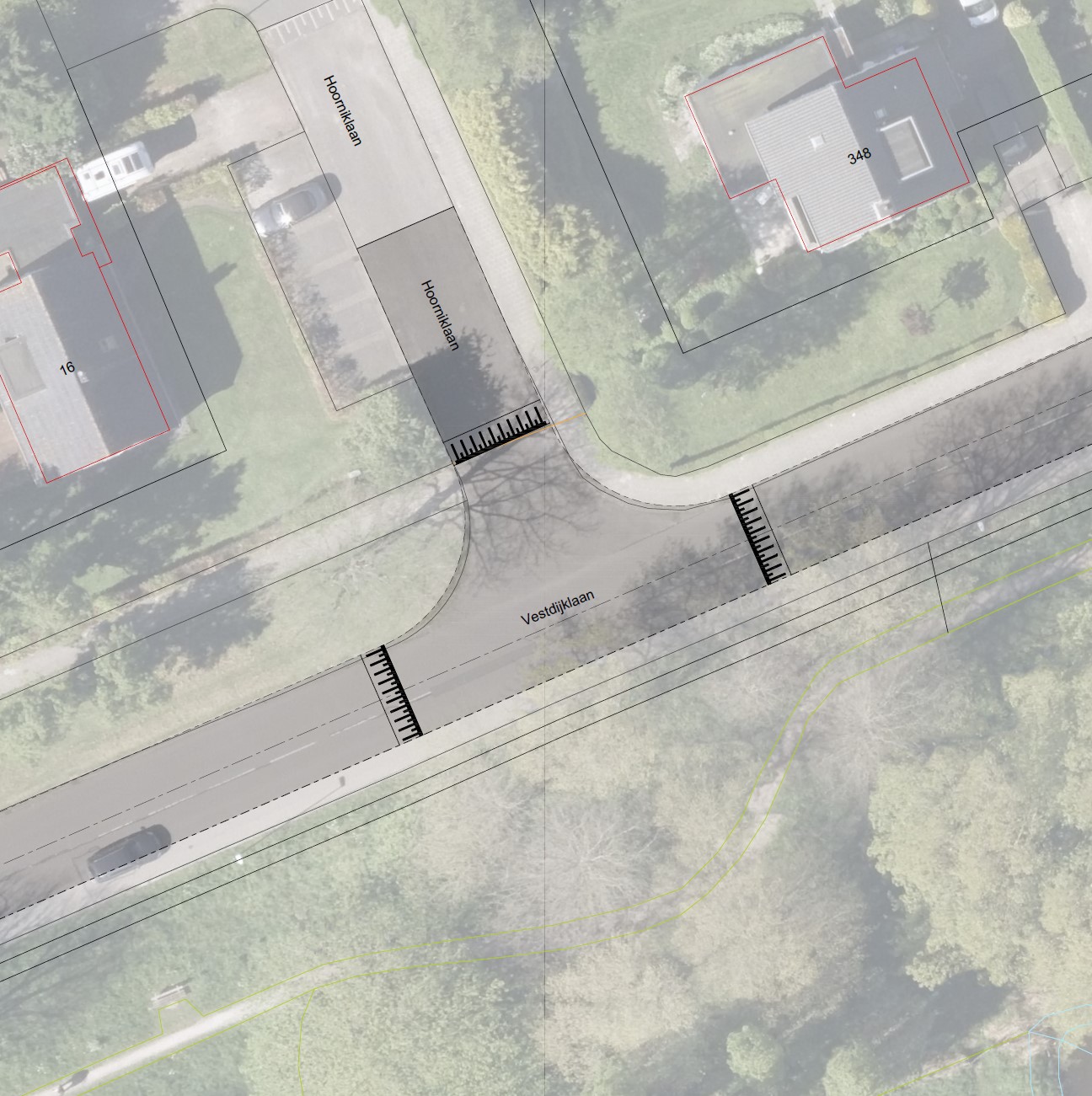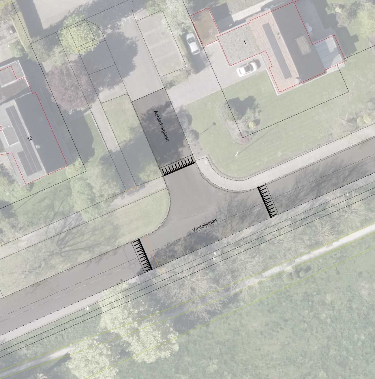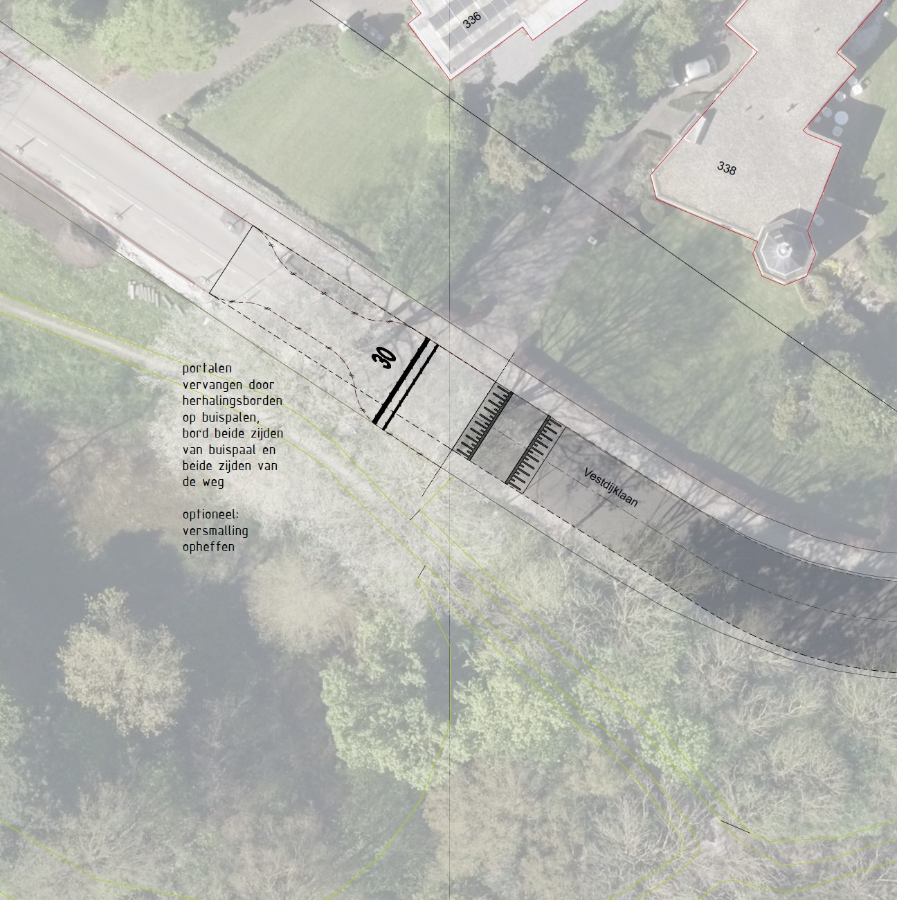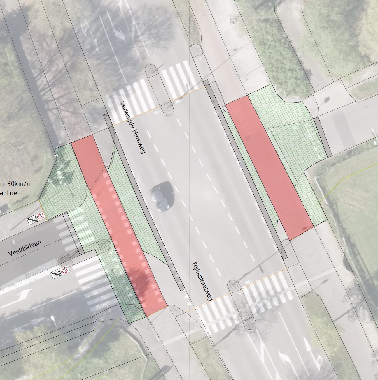 Omdat er nu een onderhoudsopgave ligt voor het wegdek, wordt de Vestdijklaan op dit gedeelte versmald en voorzien van snelheidsremming in de vorm van plateaus en drempels. Daarmee wordt dit deel van de Vestdijklaan gelijkgetrokken met het deel dat in 2024 is versmald en vernieuwd. In principe wordt de Vestdijklaan met een uitritconstructie aangesloten op de Rijksstraatweg/Verlengde Hereweg, maar het is mogelijk dat het kruispunt nog een verder herontwerp krijgt. Dis is op dit moment onderwerp van overweging en overleg. Bij de onderhoudsopgave wordt het wegprofiel op bovengenoemd wegdeel van de Vestdijklaan in lijn gebracht met de richtlijnen voor 30km/u wegen en de rest van de Vestdijklaan: de plateaus liggen zo’n 80 meter uit elkaar (overeenkomstig CROW 344 ‘Richtlijn drempels, plateaus en uitritten’, p.22), de weg wordt 5,80m breed.