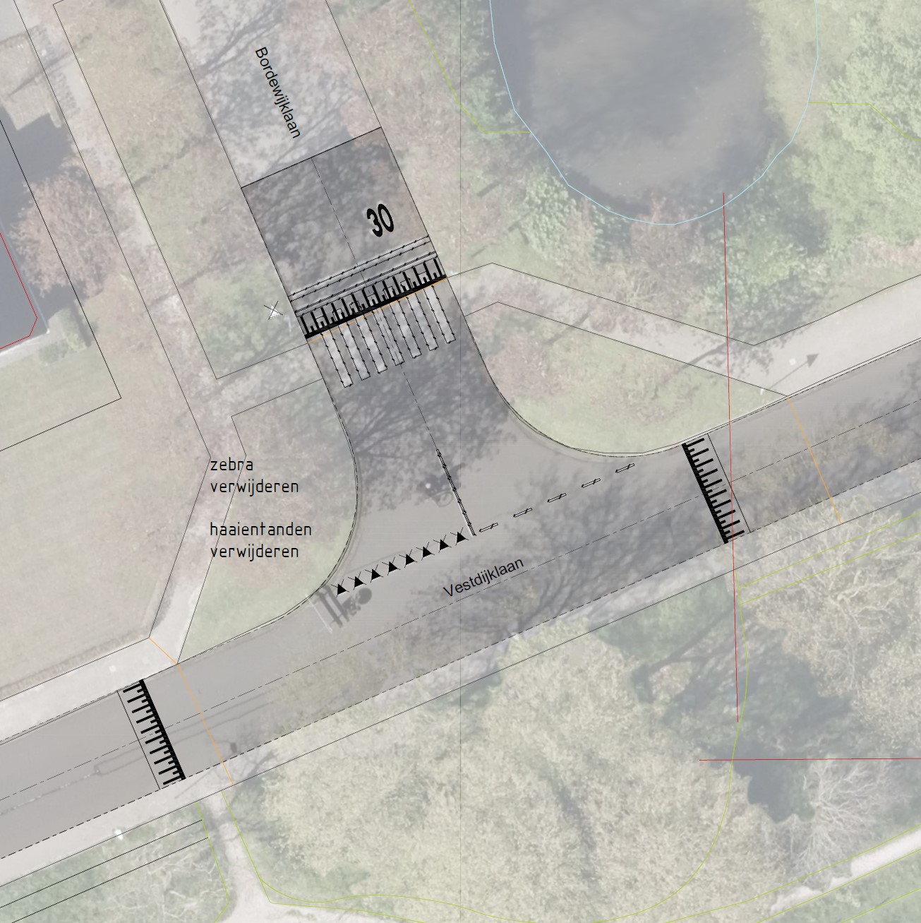 Op de Bordewijklaan bij de aansluiting met de Vestdijklaan wordt de voetgangersoversteekplaats (zebra) verwijderd. Binnen de 30km/u-zone is deze niet nodig. De kruispunten Bordewijklaan-Vestdijklaan en Elsschotlaan-Vestdijklaan worden zodanig “opgetild” dat voetgangers à niveau over kunnen steken. Er is geen sprake van verkeersdrukte die vraagt om voetgangersoversteekplaatsen. Beide kruispunten worden ook gelijkwaardig: de haaientanden worden verwijderd.