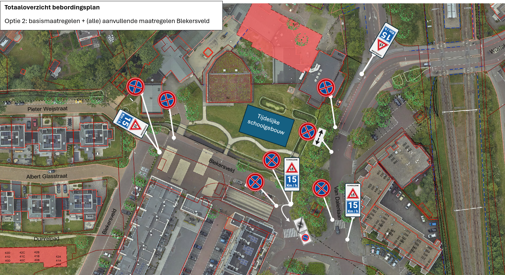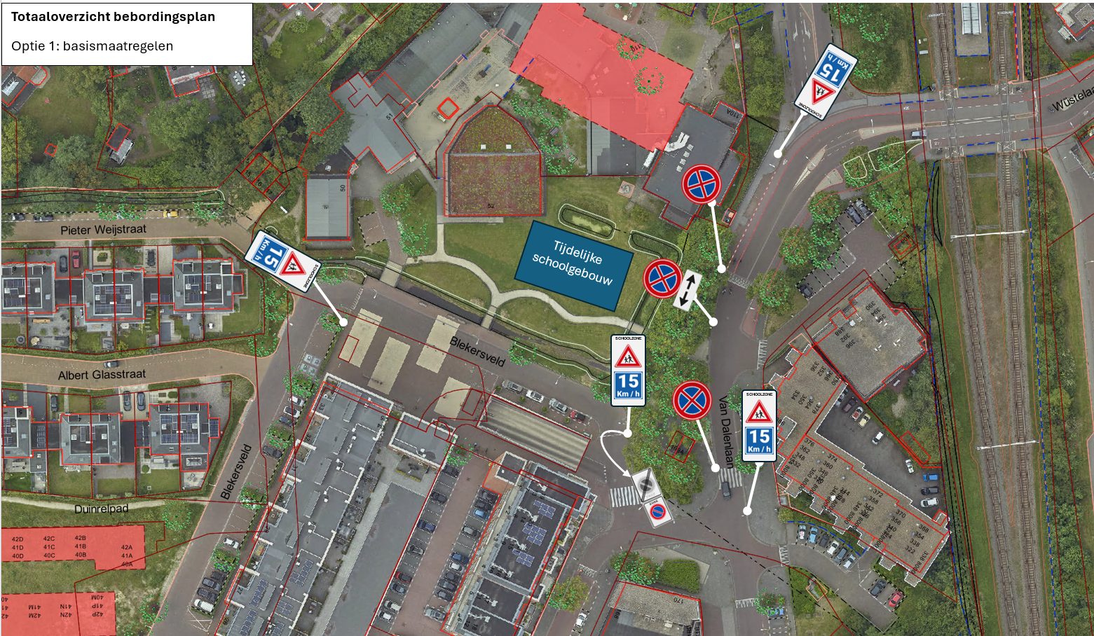 Het van belang is om passerende weggebruikers te informeren over de aanwezigheid van de basisschool ter hoogte van de toegangen tot het tijdelijke schoolgebouw. Op Blekersveld zal met name veel winkelend publiek aan het begin nog moeten wennen met de aanwezigheid van het tijdelijke schoolgebouw en op de Van Dalenlaan is de verwachting dat er meer oversteekbewegingen zullen plaatsvinden richting het tijdelijke schoolgebouw.