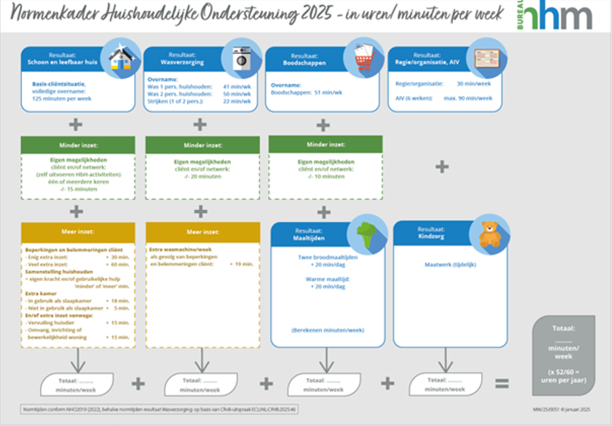 De normtijden, activiteiten en frequenties van de huishoudelijke ondersteuning zijn gebaseerd op het Normenkader Huishoudelijke Ondersteuning 2025 van Bureau HHM.