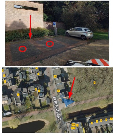 We wijzen twee parkeerplaatsen aan voor het opladen van elektrische auto’s nabij Perenstraat 14. Hiervoor plaatsen we borden (E08c) uit bijlage 1 van het Regelement Verkeersregels en Verkeerstekens 1990. Hieronder plaatsen wij een onderbord (OB504) met de tekst “geldt voor twee parkeervakken”.