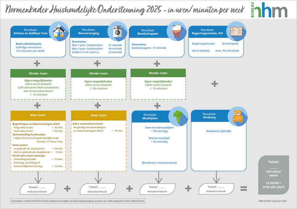In januari 2025 hebben we naar aanleiding van een uitspraak van de Centrale Raad van Beroep (ECLI:NL:CRVB:2025:46) de normtijden voor het resultaat Wasverzorging met enkele minuten aangepast. Daarmee is een nieuwe versie van dit normenkader ontstaan, met ook een bijgestelde naam: het Normenkader Huishoudelijke Ondersteuning 2025. Dit kader is onverminderd gebaseerd op de onderzoeken die in 2016 zijn uitgevoerd door KPMG Plexus en bureau HHM.