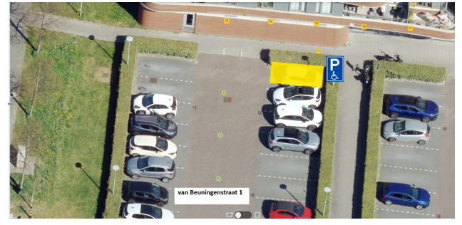 Een parkeerplaats aan de van Beuningenstraat ter hoogte van de ingang van het appartementencomplex in te stellen als een individuele gehandicaptenparkeerplaats, door het plaatsen van bord model E6 van Bijlage 1 van het RVV 1990, voorzien van een onderbord met daarop aangegeven het kenteken van het voertuig van de aanvrager (P-766-XF) en het markeren van het betreffende vak;