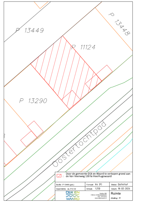 De gemeente Dijk en Waard is voornemens een stuk grond op adres Van Veenweg 130 te Heerhugowaard te verkopen, te weten een gedeelte van de grond kadastraal bekend Gemeente Heerhugowaard, Sectie P, nummer 13449, met een (nog door het kadaster vast te stellen) oppervlakte van ongeveer 312 m2.