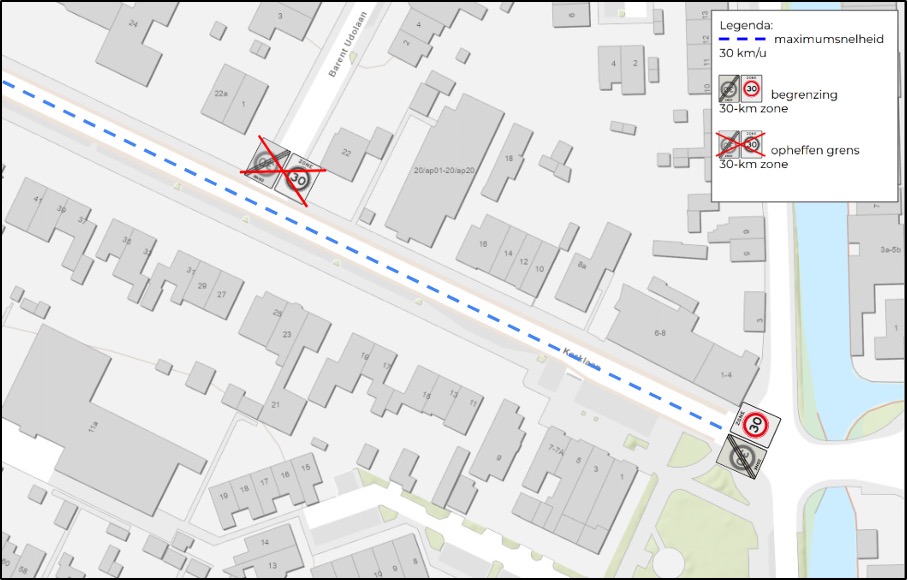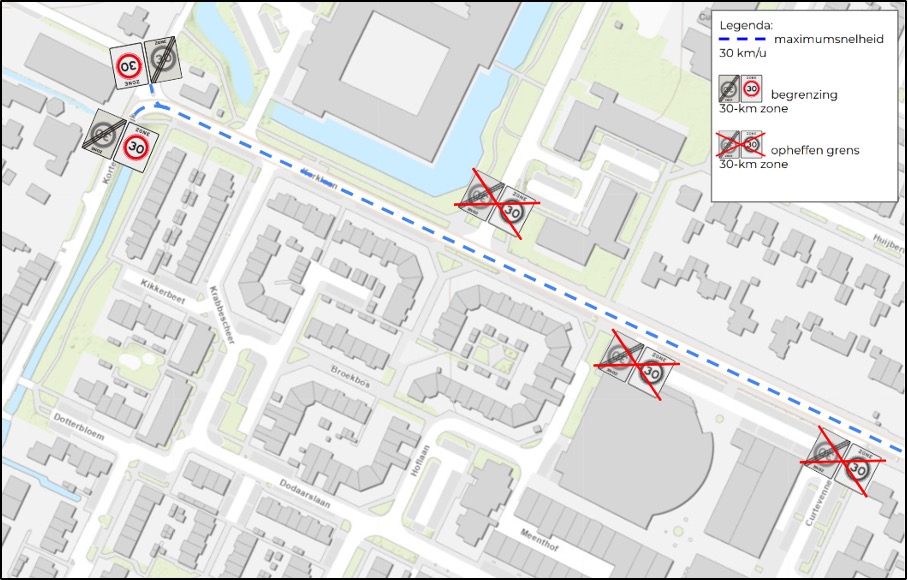 • dat in verband daarmee op de aansluitende zijwegen de bestaande borden als aanduiding van de begrenzing van de 30-km zone worden verwijderd en deze wegen, tezamen met de Kerklaan, een onderdeel worden van een uitgebreide 30-km zone;