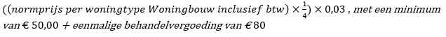 Voor verhuur van snippergroen berekenen we de verhuurprijs per m² per jaar aan de hand van de normprijzen per zonering per woningtype voor woningbouw zoals vermeld in de tabel in § 4.2 van deze Grondprijzenbrief. Deze normprijs vermenigvuldigen we met een factor 1,21. Het resultaat daarvan vermenigvuldigen we eerst met een factor 0,25 en vervolgens met een factor 0,03 (dat is namelijk het minimale canonpercentage voor erfpacht (3%) van de normprijzen voor woningbouw. Voor de verhuurprijs geldt dat we een minimale prijs van € 50,00 per jaar in rekening brengen en € 25,00 per jaar in het geval er kabels en leidingen in de grond leggen. Hierbij geldt dat we een minimale huurprijs van € 50,00 in rekening brengen. Als er een verhuursituatie ontstaat waarbij geen woningtype uit deze brief is aan te wijzen, hanteert de gemeente voor het berekenen van de verhuurprijs de normprijs/m2 van een vrijstaande woning.