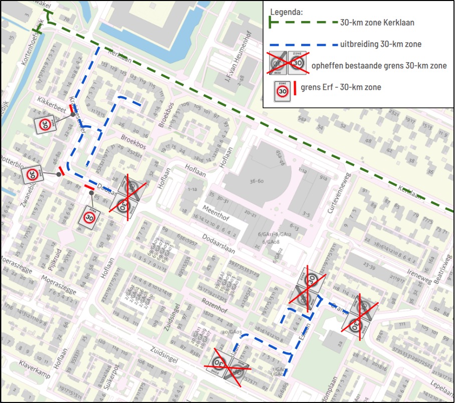 • dat deze maatregel wordt gerealiseerd door het het verwijderen van de begin/einde zoneborden A1-30 van bijlage 1 van het RVV 1990 van de Dodaarslaan nabij het kruispunt met de Hoflaan en nabij het kruispunt met de Curtevenneweg, op de Oranjeweg ter hoogte van het kruispunt met de Lepelaarlaan en op de Elslaan ter hoogte van het kruispunt met de Zuidsingel;