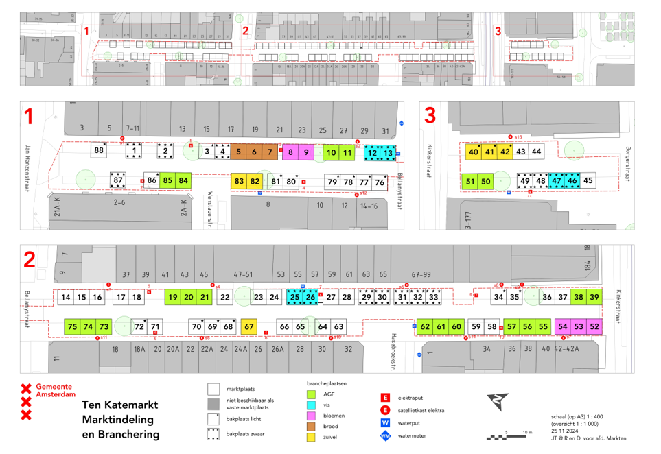 Op de marktplattegrond staan de enkelvoudige marktplaatsen aangeven. In het inrichtingsbesluit wordt het aantal enkelvoudige marktplaatsen op de Ten Katemarkt bepaald op 88. Dit aantal is tot stand gekomen door aanpassingen die de afgelopen jaren op het marktterrein hebben plaatsgevonden. Vanwege de ingang van de Foodhallen zijn de kramen die daar stonden verplaatst. Er is ook een afvaleiland in een bedrijfsruimte achter de markt gekomen, waarvoor er tussen de kramen ruimte is gemaakt voor betere toegankelijkheid. Ook de aanwezige bomen en voorzieningen voor de markt, maken een ruimere opzet van de markt noodzakelijk, zeker vanuit veiligheidsoverwegingen.