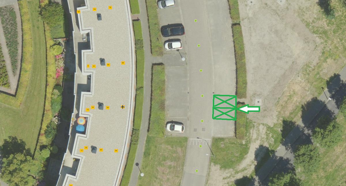 De parkeerplaatsen zijn alleen bedoeld voor het opladen van elektrische auto’s. Daarom plaatsen we het verkeersbord E08c (dit staat in bijlage I van het RVV 1990). We plaatsen ook het verkeersbord OB504 daaronder. Dit is een bord met twee pijlen die wijzen naar de parkeerplaatsen.