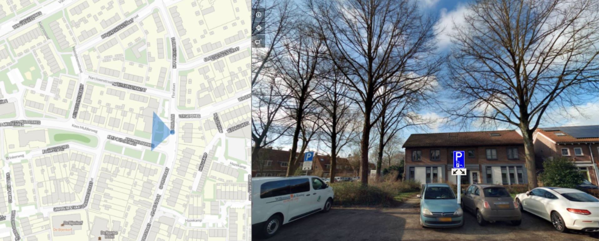 In de afbeelding hierboven staat links met een blauwe driehoek aangegeven waar de laadpaal gaat komen. Rechts kunt u zien welke twee extra parkeervakken gereserveerd worden.