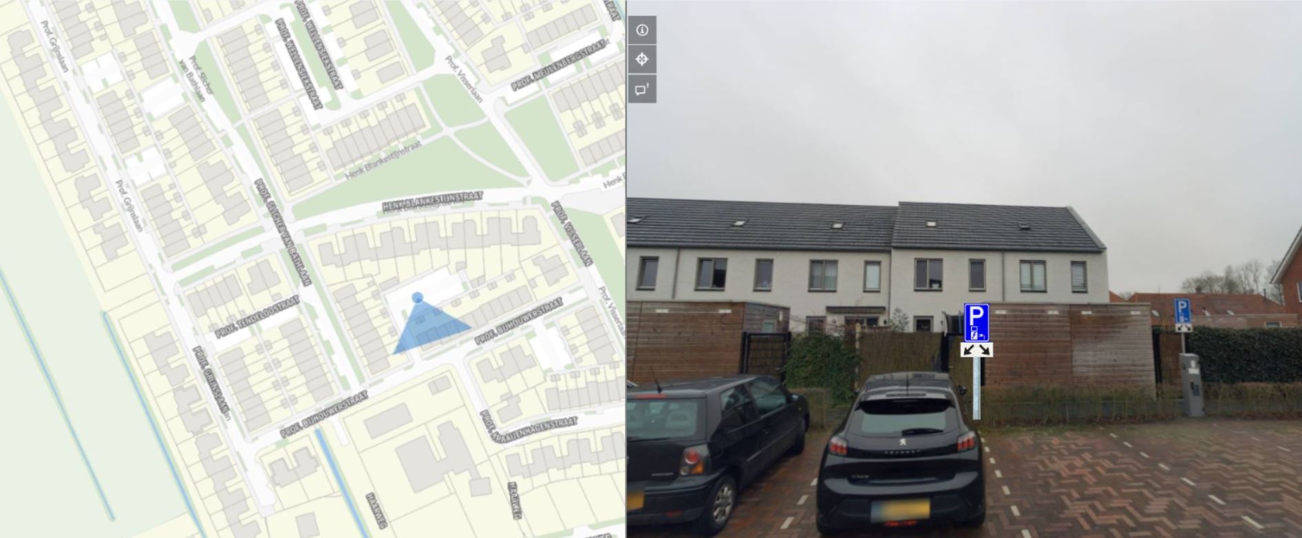 In de afbeelding hierboven staat links met een blauwe driehoek aangegeven waar de laadpaal gaat komen. Rechts kunt u zien welke twee extra parkeervakken gereserveerd worden. Deze zal dus geplaatst worden naast de huidige laadpaal, waardoor er op deze locatie vier parkeerplaatsen gereserveerd zullen zijn voor het opladen van elektrische voertuigen.