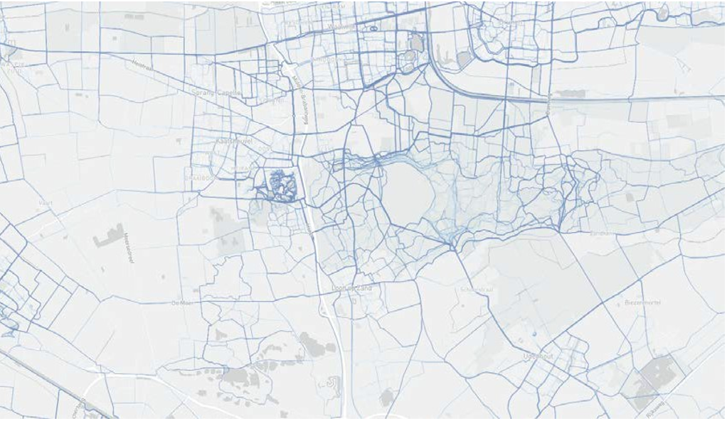 In de heatmap (warmtekaart) voor activiteiten ‘te voet’ zien we uiteraard veel activiteit in het Nationaal Park de Loonse en Drunense Duinen. We zien een aantal toegangspunten zoals bij de Waalwijksebaan, Roestelbergseweg en Schoorstraat (net buiten de gemeente), vanuit waar men uitwaaiert door het park. In het natuurgebied Huis ter Heide zien we duidelijker de vaste wandelroutes terug. Daarnaast is ook de Efteling een opvallende hotspot in de heatmap voor loopactiviteiten.