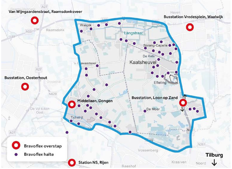 De extra vervoerservice op afroep door BravoFlex is een mogelijkheid als aanvulling op het reguliere OV. BravoFlex maakt géén onderdeel uit van de concessie, maar wordt door de provincie Noord-Brabant ingekocht als onderdeel van de contracten voor het Flex-vervoer dat de regio’s inkopen. De provincie werkt hierbij samen met Regiovervoer Midden-Brabant. Bravoflex biedt een flexibele vervoerservice op afroep in de gemeente Loon op Zand (binnen het servicegebied liggen ook Waalwijk en Dongen). Deze service rijdt zonder vaste route en dienstregeling. Vanaf de haltes in het servicegebied worden reizigers opgehaald bij een Bravoflex-halte naar keuze en naar een van de zes OV-overstapstations gebracht. Vanaf de start van BravoFlex ligt er een wens om de halte Efteling toe te voegen als OV-overstapstation. De haltes betreffen de haltes van streeklijn 136, met daarbij nog een halte in de kern van De Moer. Deze dienst is beschikbaar tussen 07:00 en 24:00 uur (zon- en feestdagen vanaf 08:00). Dit ruime tijdsbestek zorgt ervoor dat inwoners op vrijwel elk moment van de dag gebruik kunnen maken van de service. Wat het vervoer flexibel en afgestemd op de individuele behoeften van de reizigers maakt.