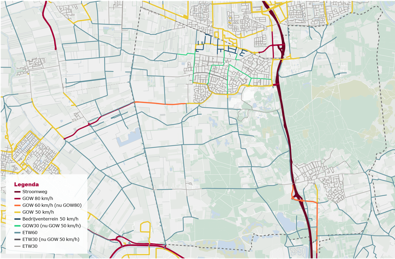 Vanuit het oogpunt van verkeersveiligheid is het goed om op gebiedsontsluitingswegen buiten de bebouwde kom een maximumsnelheid van 60 km/h te laten gelden. De aanwezigheid van bomen en andere obstakels langs de weg (binnen de obstakelvrije zone) en het ontbreken van gescheiden rijbanen vormen risico’s voor voertuigen die van de weg raken. Bij een snelheid van 80 km/h is de kans op ernstige ongevallen groter, terwijl een lagere snelheid van 60 km/h de kans op ernstige letsels vermindert. Daarnaast zijn er op deze wegen vaak inritten, kruispunten en rotondes aanwezig, wat vooral bij hogere snelheden het risico op conflicten en ongevallen verhoogt.