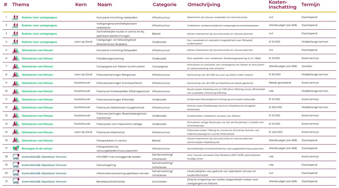 De onderwerpen die op deze agenda staan zijn bepaald door de inwoners van de gemeente. Er is onder andere behoefte aan nieuwe vormen van publiek vervoer zoals deelfietsen of pendelbusjes. Verder worden genoemd: een integrale visie op het stimuleren van elektrisch rijden door extra laadpalen te plaatsen en een autoluw centrum van Kaatsheuvel met ruimte voor groen en extra laad- en losplekken.