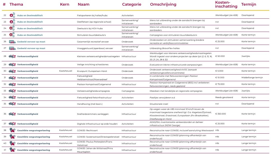 Voor deze maatregelen wordt de uitwerking in het Mobiliteitsprogramma nog niet afgerond. Vaak moet met betrekking tot de inhoud van de maatregelen nog een aantal knopen worden doorgehakt. In sommige gevallen zorgt de complexiteit van de maatregel ervoor dat hij niet kan worden aangemerkt als korte termijnmaatregel. Daarnaast wordt bekeken hoe projecten gecombineerd kunnen worden, zodat werk-met-werk gemaakt kan worden.