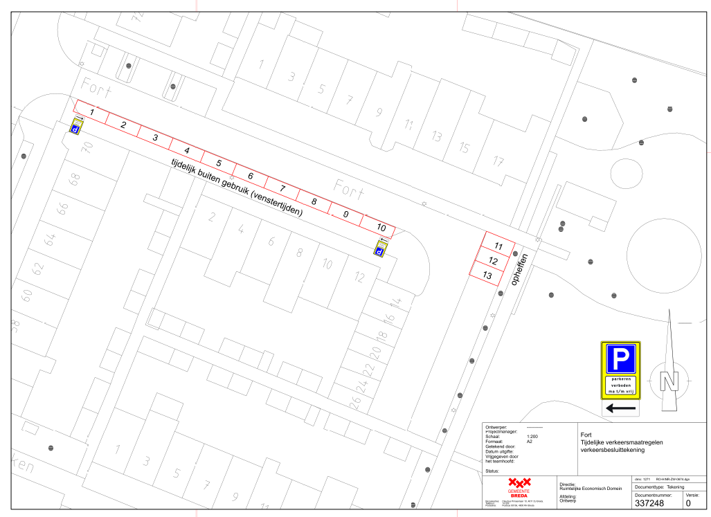 Het verkeersbord E04, parkeergelegenheid, met onderbord OB310 (parkeren verboden ma t/m vrij) en onderbord OB501-L en OB501-R wordt twee keer geplaatst op het Fort ter hoogte van de kruising met Zuilenstraat en het Fort 12. Een en ander zoals weergegeven op de bijgevoegde tekening ‘Fort Tijdelijke verkeersmaatregelen verkeersbesluittekening’.
