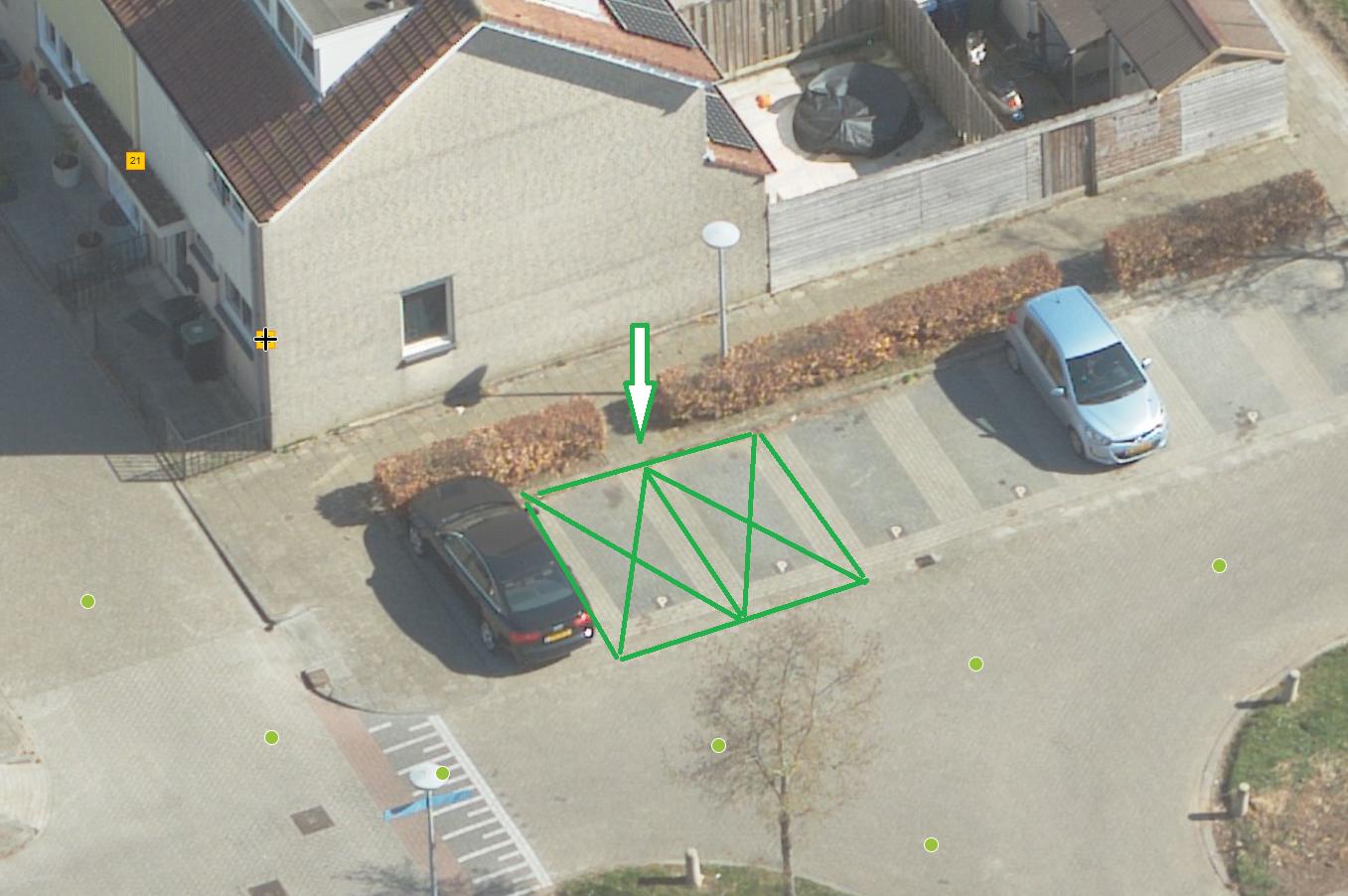 De parkeerplaatsen zijn alleen bedoeld voor het opladen van elektrische auto’s. Daarom plaatsen we het verkeersbord E08c (dit staat in bijlage I van het RVV 1990). We plaatsen ook het verkeersbord OB504 daaronder. Dit is een bord met twee pijlen die wijzen naar de parkeerplaatsen.