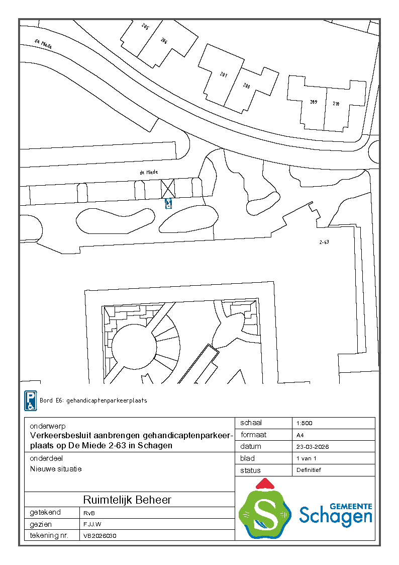 Gemeente Schagen- Verkeersbesluit aanleg algemene gehandicaptenparkeerplaats nabij De Miede 2-63, Schagen.