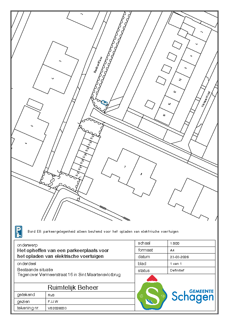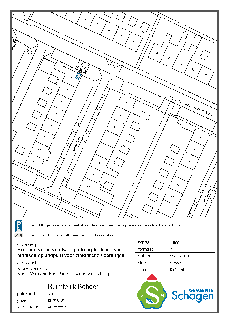 Gemeente Schagen- Verkeersbesluit reserveren van een parkeerplaats voor het opladen van elektrische voertuigen nabij Vermeerstraat 2, St. Maartensvlotbrug, alsmede intrekken eerdere verkeersbesluit (Gemeenteblad jaargang 2025, nummer 247663)