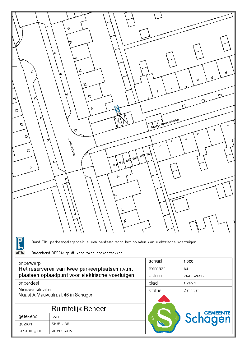Gemeente Schagen- Verkeersbesluit reserveren van 2 parkeerplaatsen voor het opladen van elektrische voertuigen nabij A. Mauvestraat 46, Schagen.