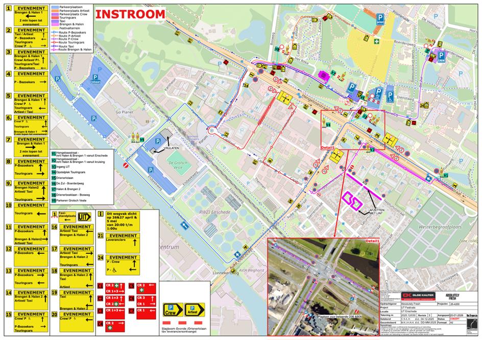 door het plaatsen van de verkeersborden D2 en D3 van bijlage 1 van het RVV 1990 volgens het verkeersplan (zie bebordingsplan), op de Auke Vleerstraat en de Hengelosestraat een gebod tot het volgen van de rijrichting die op het bord is aangegeven op diverse rijstroken die leiden naar een afgesloten wegvak voor de periode van 09:00 tot 02:00 uur, of zoveel korter als mogelijk is of zoveel langer als noodzakelijk, vanaf zaterdag 18 april 2026 tot en met zondag 19 april 2026;